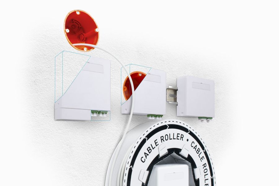 Das CobiNet FttH-Anschluss-Set. Einfach abrollen, einlegen, befestigen – fertig!