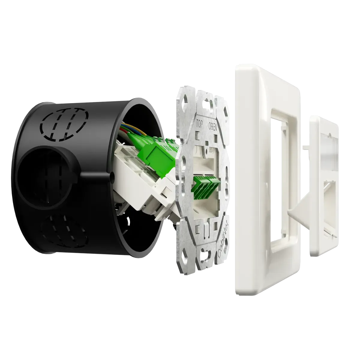 Anders als bei kupferbasierten RJ45-Netzwerkanschlüssen, die sich seit Jahren dank passender UAE-Abdeckungen nahtlos in bestehende Schalterprogramme integrieren lassen, fehlt es bei Glasfaserlösungen häufig an einer ästhetisch überzeugenden Unterputz-Alternative.