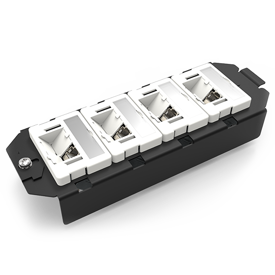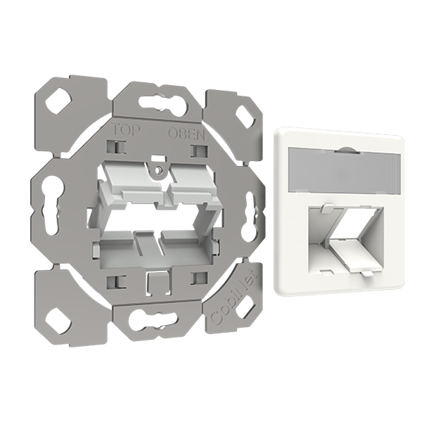 The RJ45-TL® rapid support plate offers an effortless mounting solution for data jacks in empty- or duct installation boxes. The jack simply snaps into the carrier frame. In addition to simple installation, the included central plate has dust protection flaps and a large labeling window of 12mm which supports a 2-line printed label.