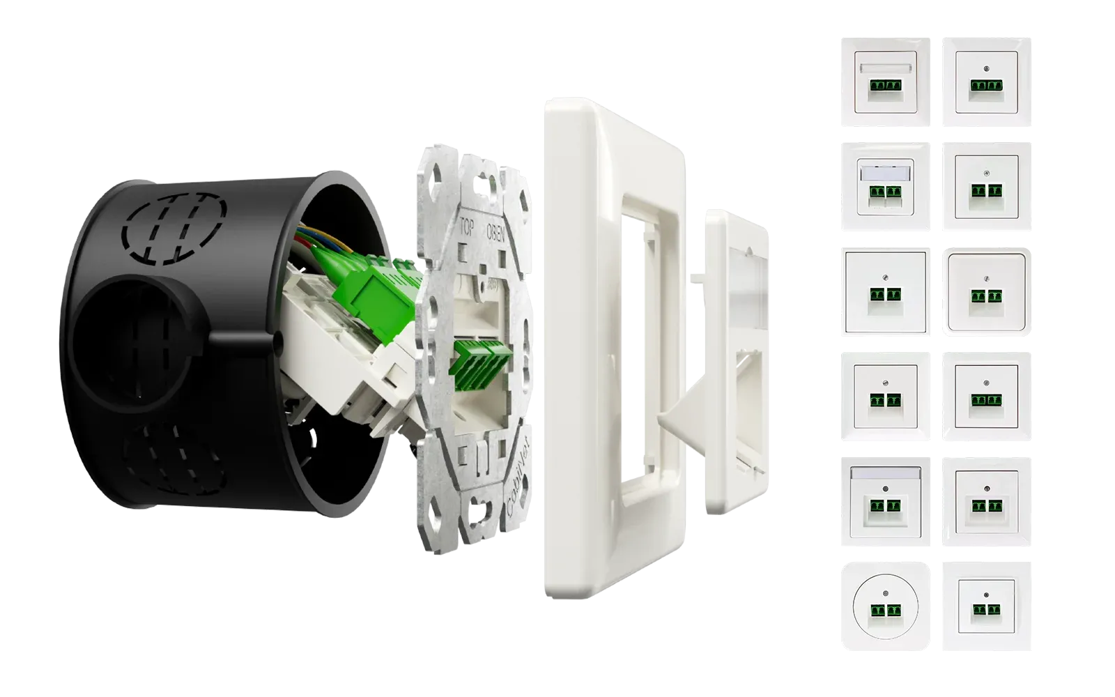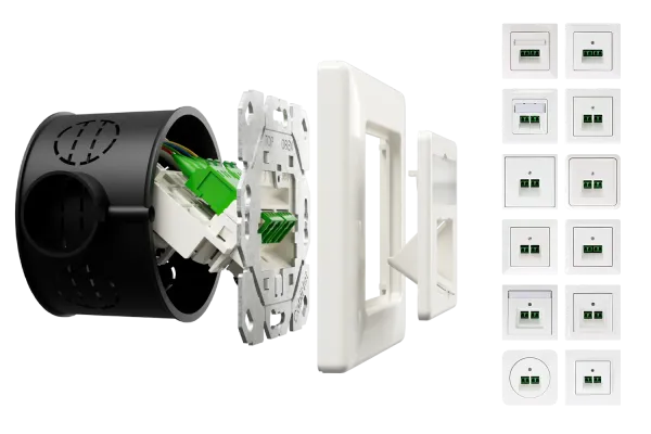 Neben der Technik überzeugt die Anschlussdose durch ihre voll designfähige Optik: denn sichtbare Aufputz-Glasfaseranschlussdosen gelten oft als störend. Dank der Kompatibilität zu UAE-Abdeckungen (45°-Schrägauslass) nahezu aller deutschen Schalterprogrammserien fügt sich die Anschlussdose ebenso dezent wie seit Jahrzehnten gewohnte Unterputz-RJ45-Anschlussdosen in die Raumgestaltung ein – für ein einheitliches Erscheinungsbild bei gleichzeitig voller Übertragungsleistung.